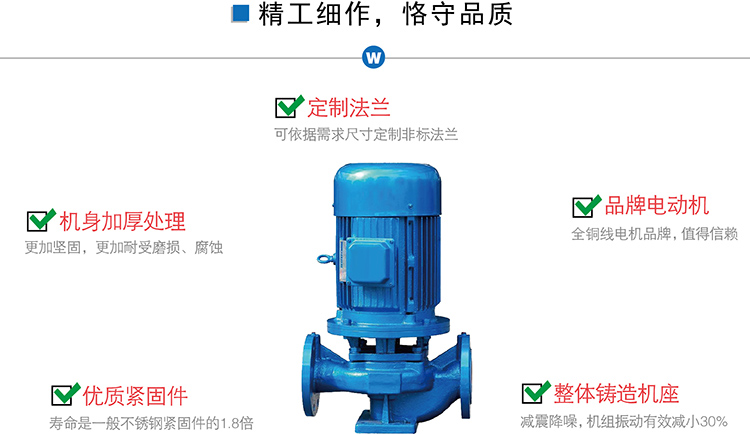 1、泵為立式結構,進出口口徑相同,且位于同一中心線上,可象閥門一樣安裝于管路之中,外形緊湊美觀,占地面積小,建筑投入低,如加上防護罩則可置于戶外使用。