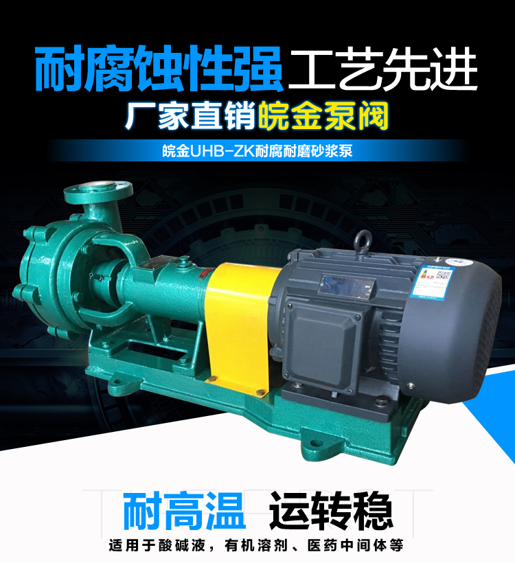 UHB-ZK耐腐耐磨砂漿泵能適應各種不同的工況。如:既可以傳送酸、堿類清液或料漿,也可以輸送冶煉行業各種腐蝕性礦漿,還可以輸送硫酸行業各類稀酸、環保行業的各類污水等。可輸送濃度80%以下的硫酸、50%以下的硝酸、鹽酸等積各類酸、堿、鹽的料漿,稀有金屬冶煉行業的各種腐蝕性砂漿及食品,酒類行業中的各類混合型介質。該泵既耐腐蝕又耐磨損,使用范圍十分廣泛。